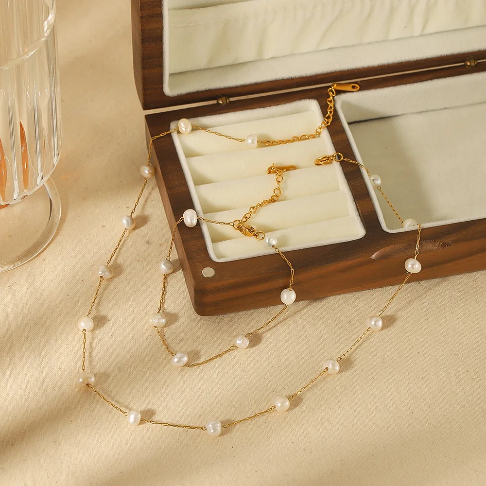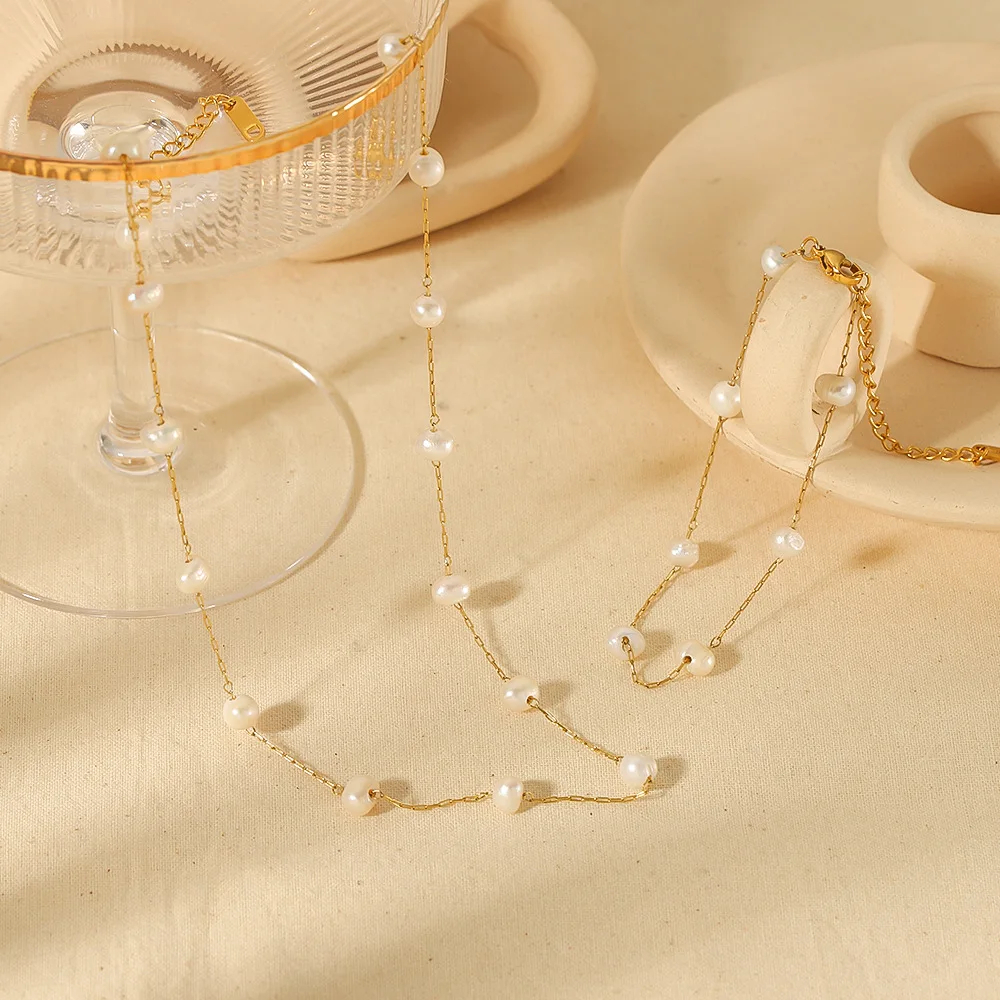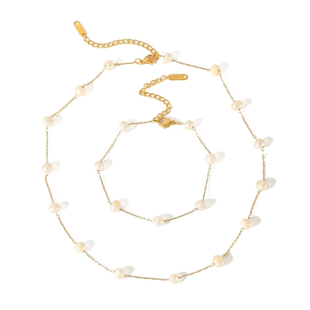 The Vionna Beaded Pearl Chain Bracelet blends soft pearls and gold links for understated elegance. Waterproof, anti-tarnish, and hypoallergenic — perfect for layering.